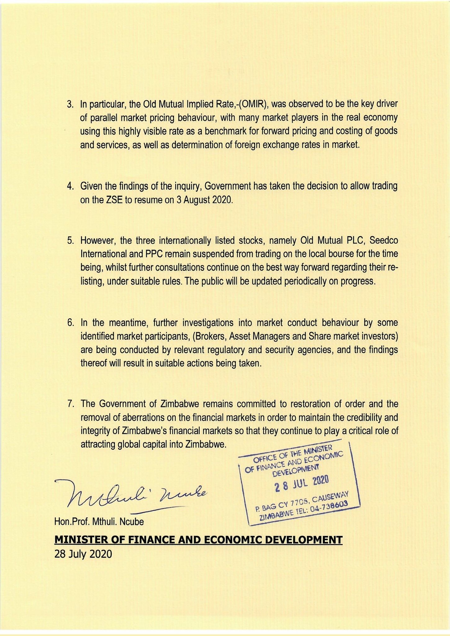 Happi Zengeni On Twitter Zse To Resume Trading On August 3